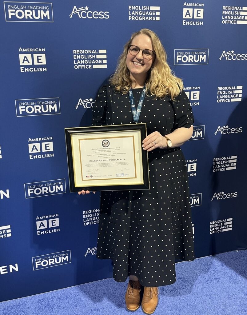 Earlier this year, Ulrich-Verslycken received the Virtual English Language Educator Impact Award in recognition of her teaching success and continued support of U.S. foreign policy through educational and cultural exchange.